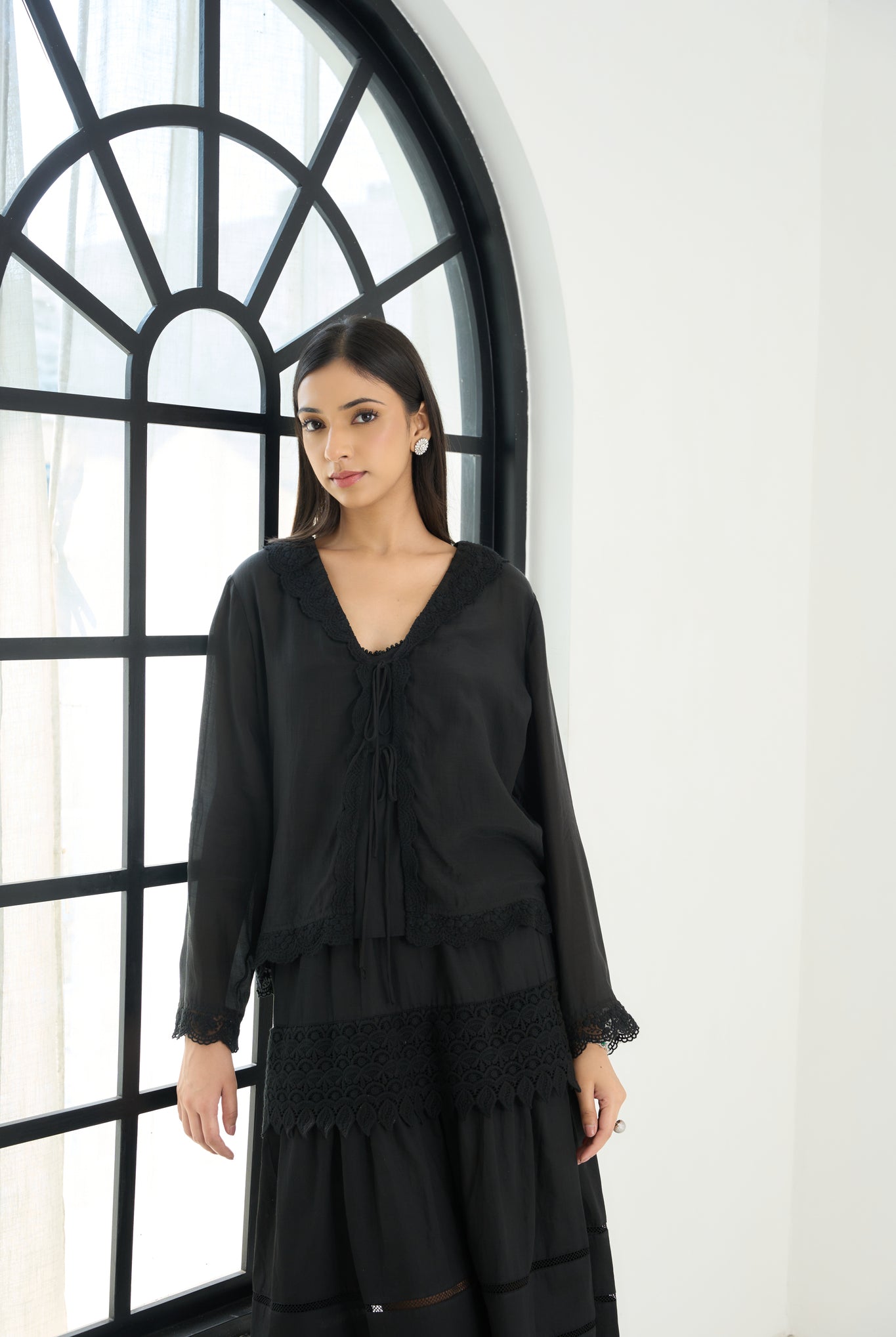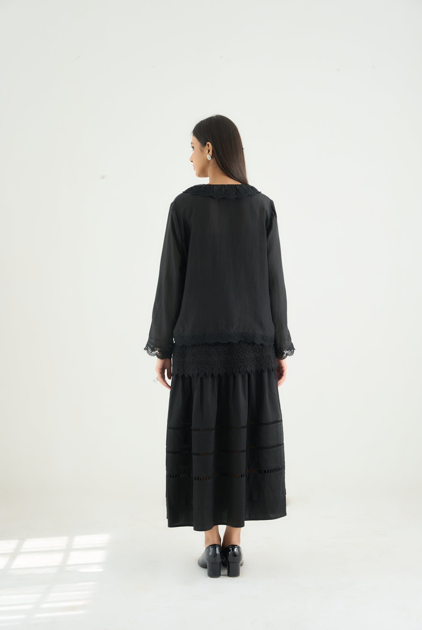 - Shirt has regular collar, front button-loop closure and raglan exaggerated sleeves