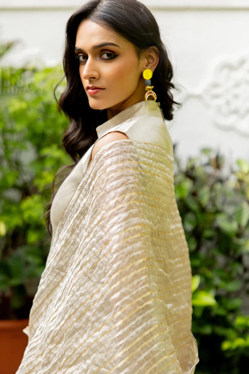 The Nirjari Set combines modern design with traditional craftsmanship. The silver mist jumpsuit features a high V-neck with collar, sleeveless cut, and dual zip closures, crafted from pure silk brocade and lined with breathable cotton. The matching silk brocade cape showcases patchwork detailing for added elegance. Perfect for special occasions.