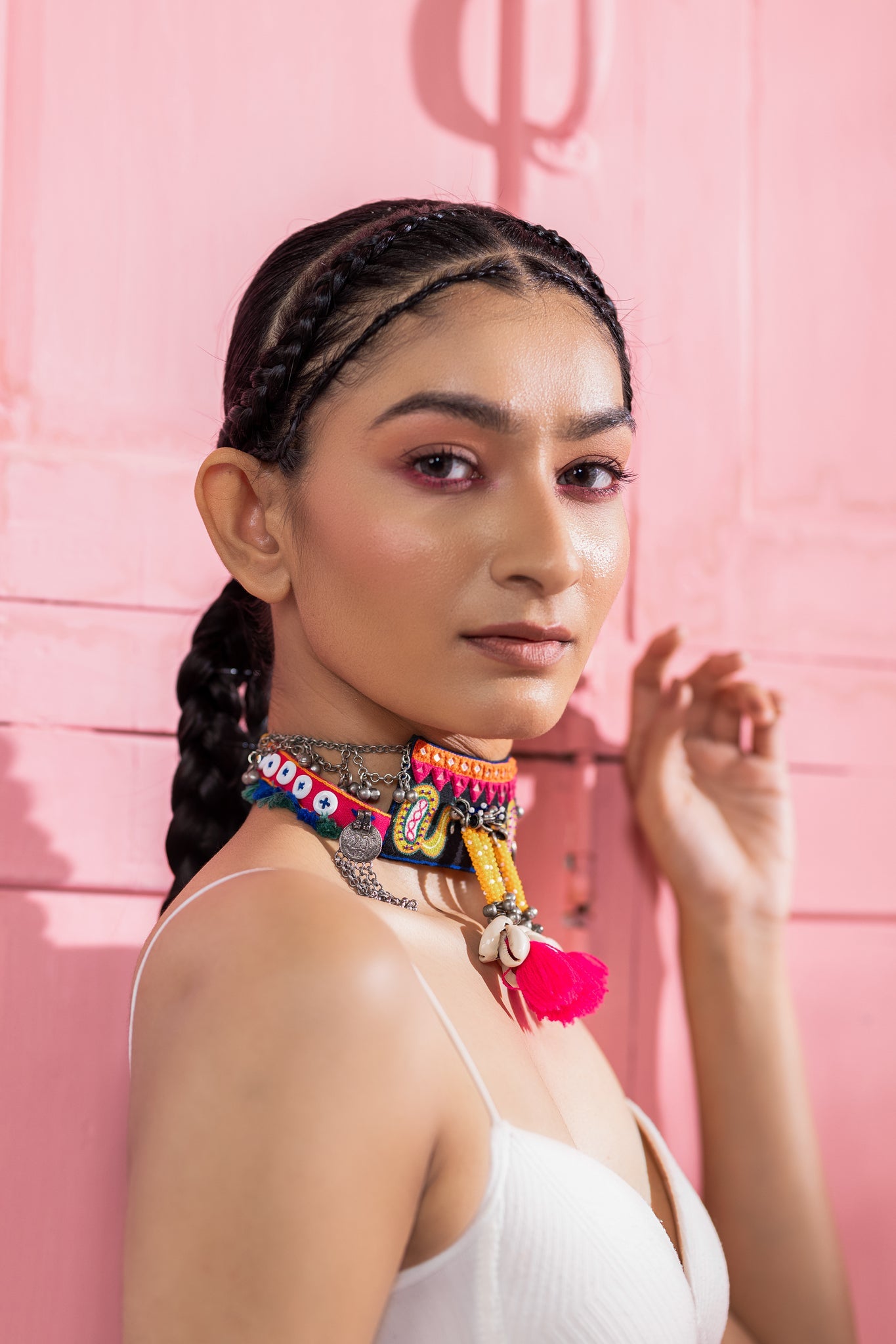 This choker combines elegance and artistry with intricate peacock motifs adorned with reflective mirrors and dangling metal accents. The result is a bold and distinctive accessory with a "Boho" influence, providing a free-spirited yet sophisticated vibe. Lightweight and secure, it adds a touch of magic to any outfit.