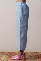 - The Pavli Trouser combines luxurious silk-cotton fabric with elegant gold and silver screen prints, complemented by half lining in mul cotton for comfort. Featuring side seam pockets and an elasticated back, it offers refined style with effortless ease.