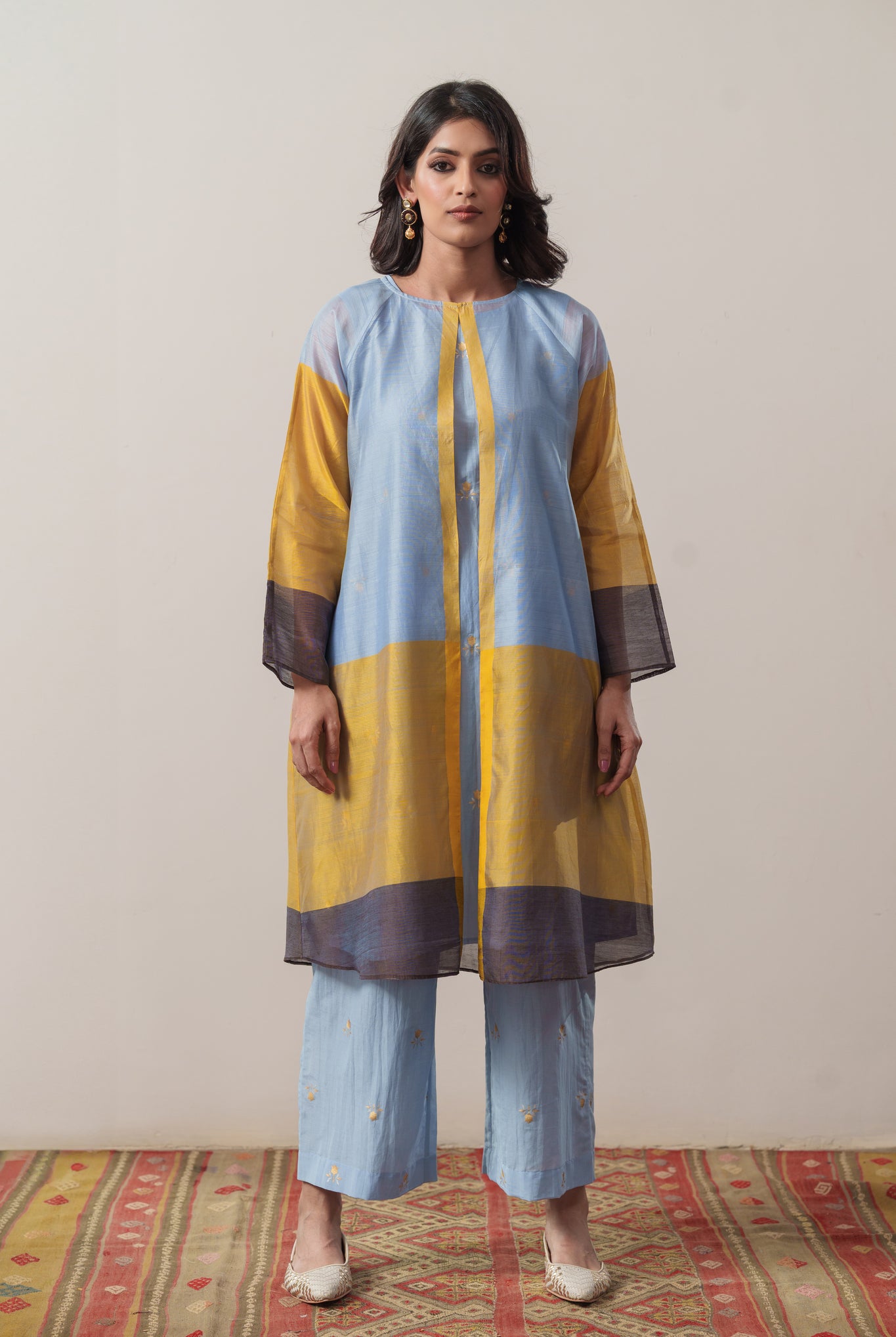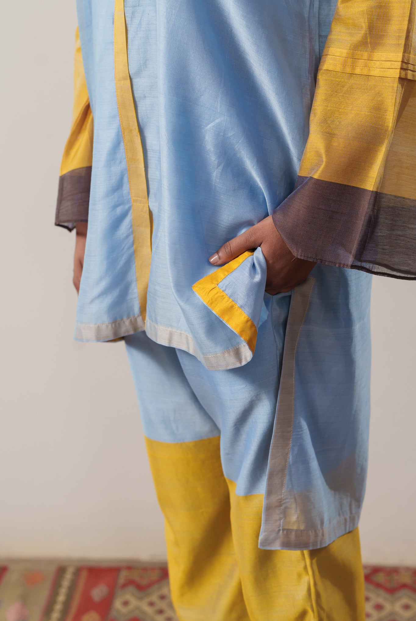 The Ragini Tala Set features a short tunic made from handwoven Chanderi fabric, designed with a gathered waist and an anti-fit silhouette that balances comfort with refined style. Subtle selvedge details at the sleeve hem adds an elegant contrast. Paired with flowing palazzo pants, this ensemble effortlessly adapts from casual days to festive evenings. Enhance your look with statement jewelry or a bold clutch for a sophisticated yet relaxed finish.