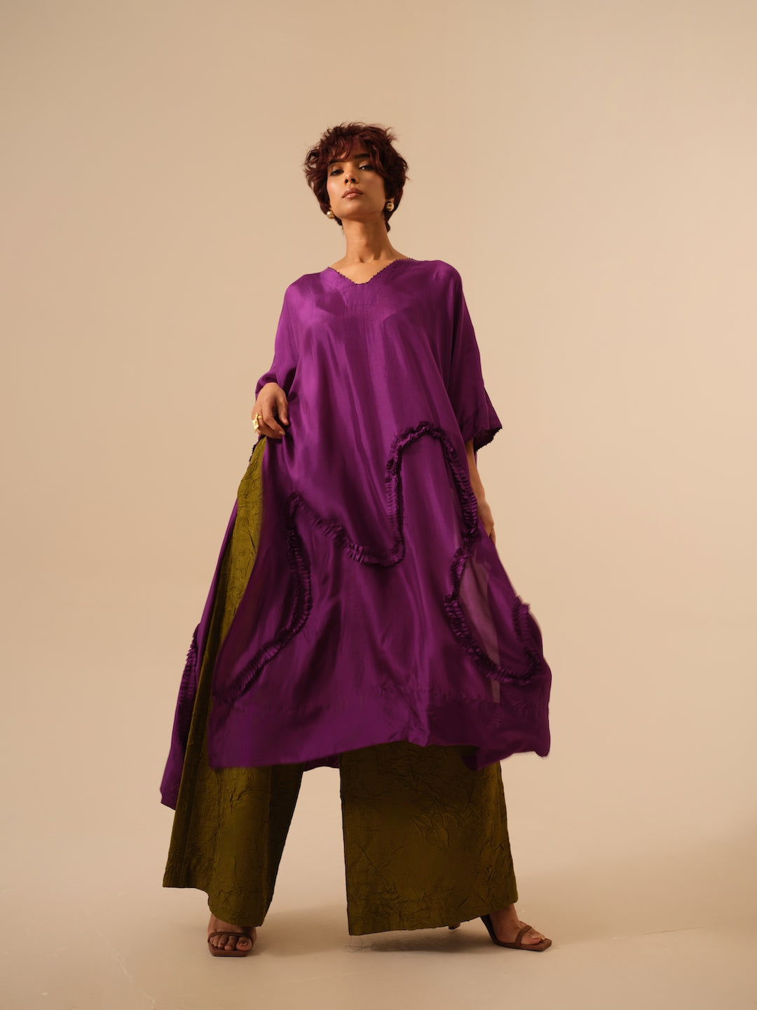 Crafted in hand-crushed silk, processed in-house by our artisans, these trousers offer a relaxed silhouette with effortless drape. Designed for comfort and ease, they feature an elasticated back for a flexible fit while maintaining a polished finish. A versatile essential that pairs seamlessly with structured or fluid separates alike.