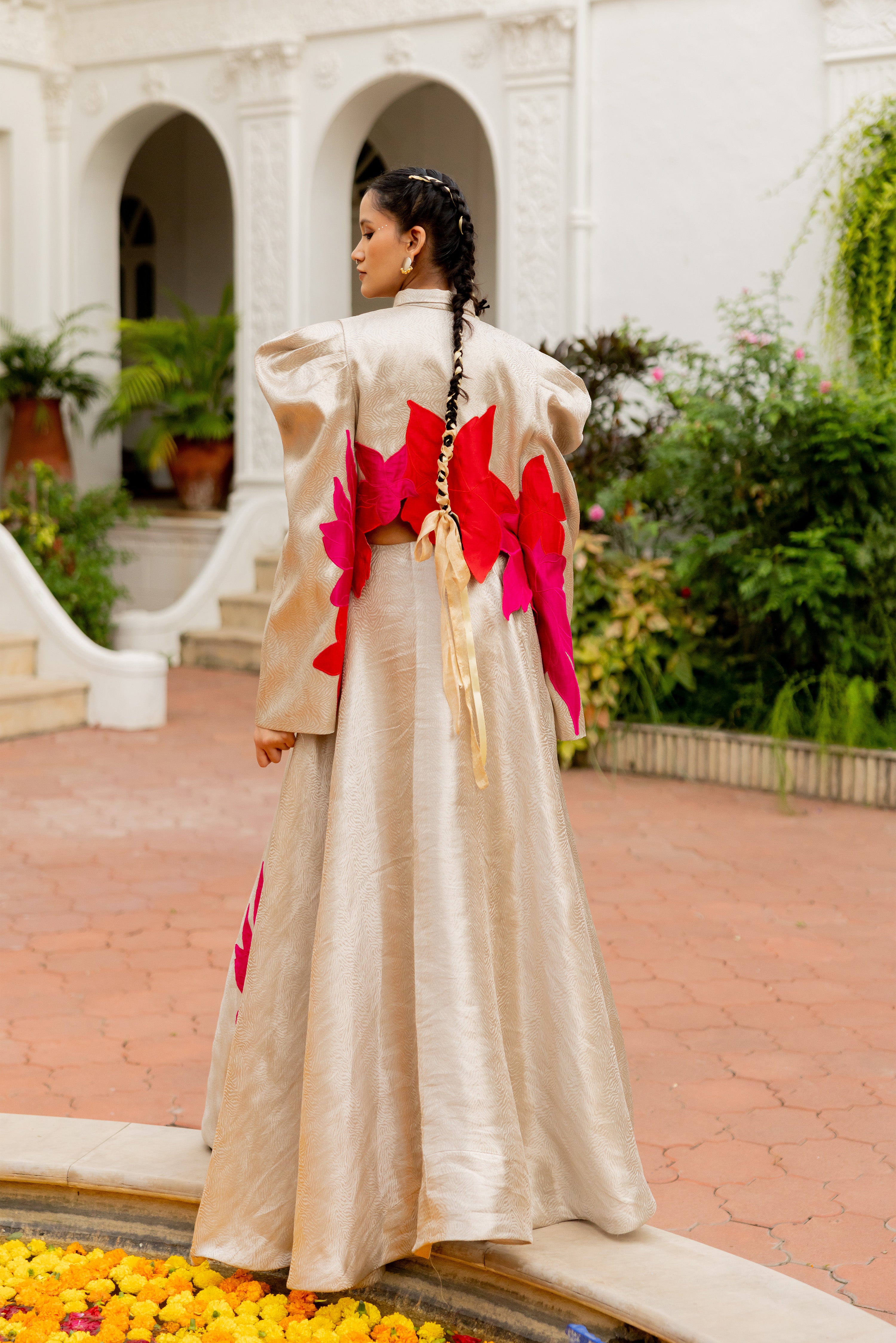 The Saanvi Set pairs a cropped shirt with exaggerated sleeves and a high-waisted skirt, both featuring signature patchwork and glass bead embroidery. Crafted from pure silk brocade in Silver Mist with breathable cotton lining, this two-piece set combines traditional artistry with modern design.