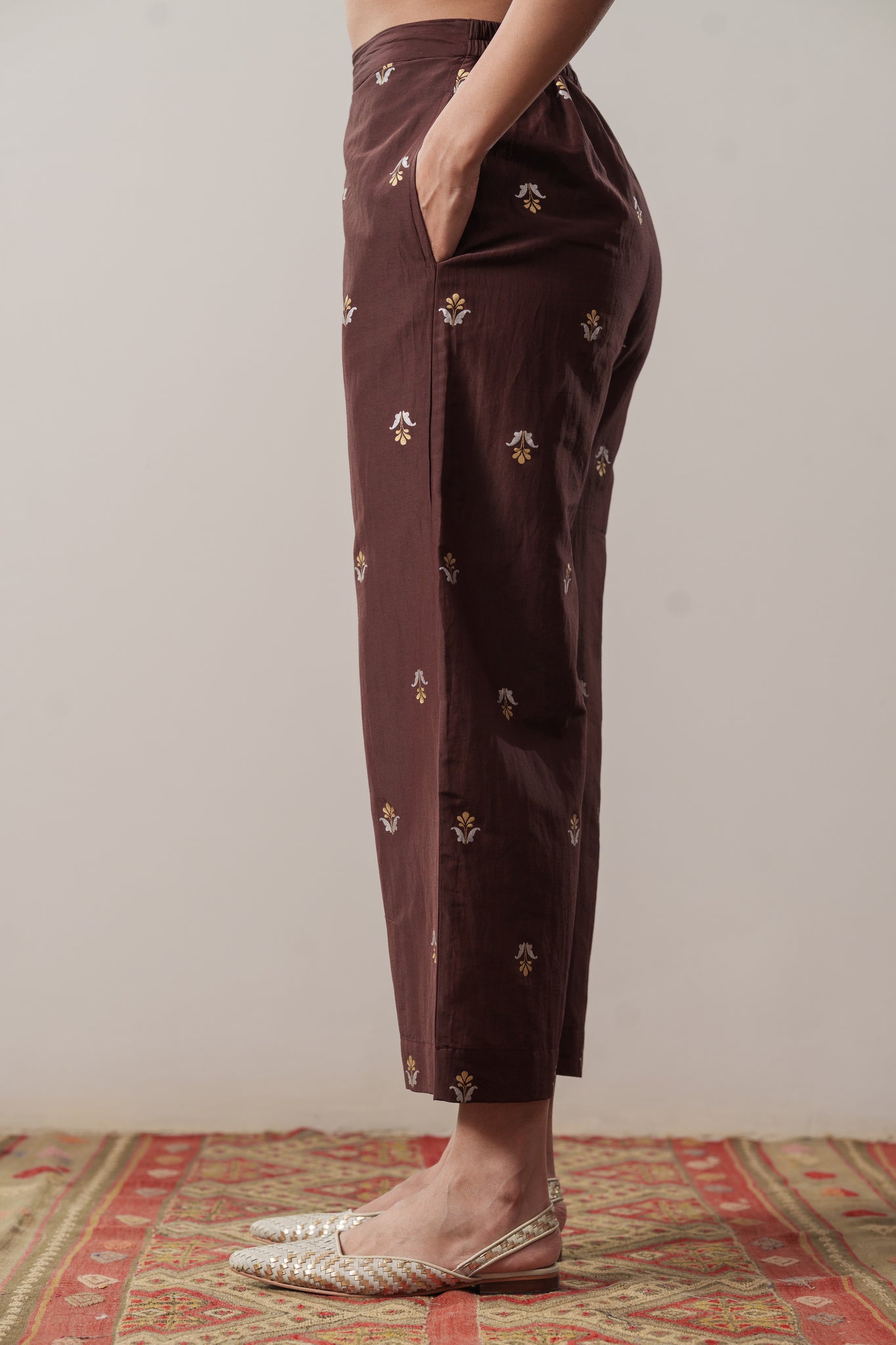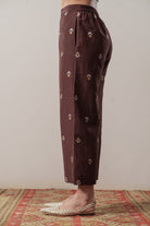 - The Saaz Trouser features luxurious silk-cotton fabric with elegant gold or silver screen printing, complemented by half lining in mul cotton for comfort. Designed with side seam pockets and an elasticated back, it offers both sophistication and ease.