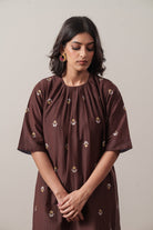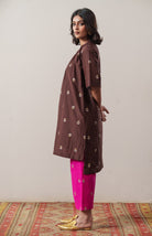 Elevate your festive attire with the Sonshi Tunic from our Shigmo collection. This Kasav Brown short-sleeved kurta, crafted from breathable silk-cotton, features delicate gold and silver floral screen prints that offer a refined shimmer. Paired with wide-legged Utsav Pink pants adorned with matching motifs, this ensemble balances bold contrast with elegant harmony. Perfect for daytime celebrations and cultural events, it delivers a sophisticated look rooted in tradition yet distinctively contemporary.