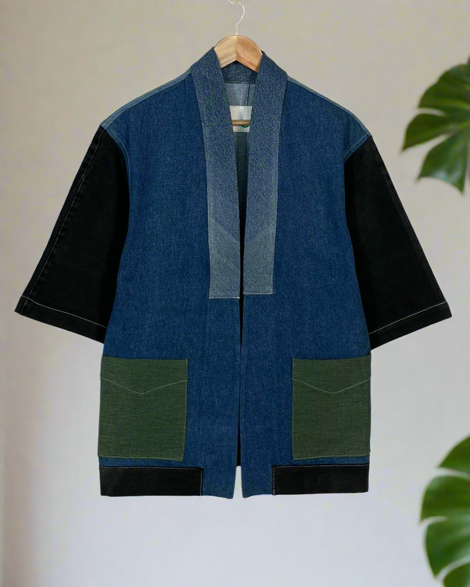 Embrace effortless versatility with our Upcycled Denim Kimono Jacket, a sophisticated piece that transcends gender boundaries. Crafted from premium 100% cotton denim, this unisex design combines durability with refined aesthetics. Distinguished by our signature green pocket detail, it seamlessly layers over any outfit, offering both comfort and timeless appeal. Perfect for those who value sustainable fashion without compromising on quality or style.