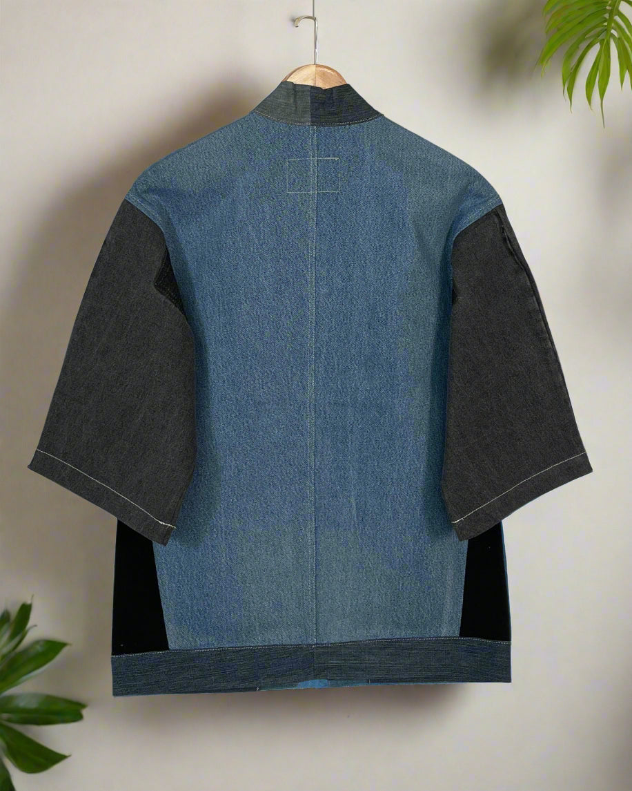 Embrace effortless versatility with our Upcycled Denim Kimono Jacket, a sophisticated piece that transcends gender boundaries. Crafted from premium 100% cotton denim, this unisex design combines durability with refined aesthetics. Distinguished by our signature green pocket detail, it seamlessly layers over any outfit, offering both comfort and timeless appeal. Perfect for those who value sustainable fashion without compromising on quality or style.